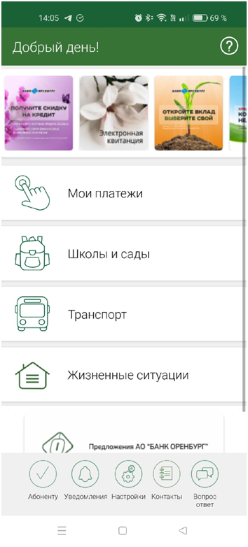 В разделах «Школы и сады» в рамках проекта АО «БАНК ОРЕНБУРГ» Вы можете: пополнять счет ребенка, просматривать историю операций и меню питания, подавать заявки.