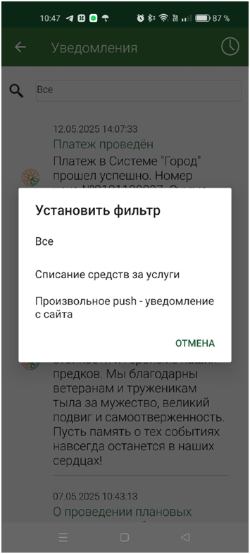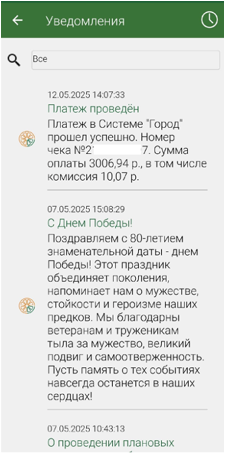В разделе «Уведомления» отражены сообщения о выставлении платежного документа на оплату, новых поставщиках услуг, работе сервисов, оплатах, регистрации и ходе рассмотрения заявок, код подтверждения операций из PUSH-уведомлений.